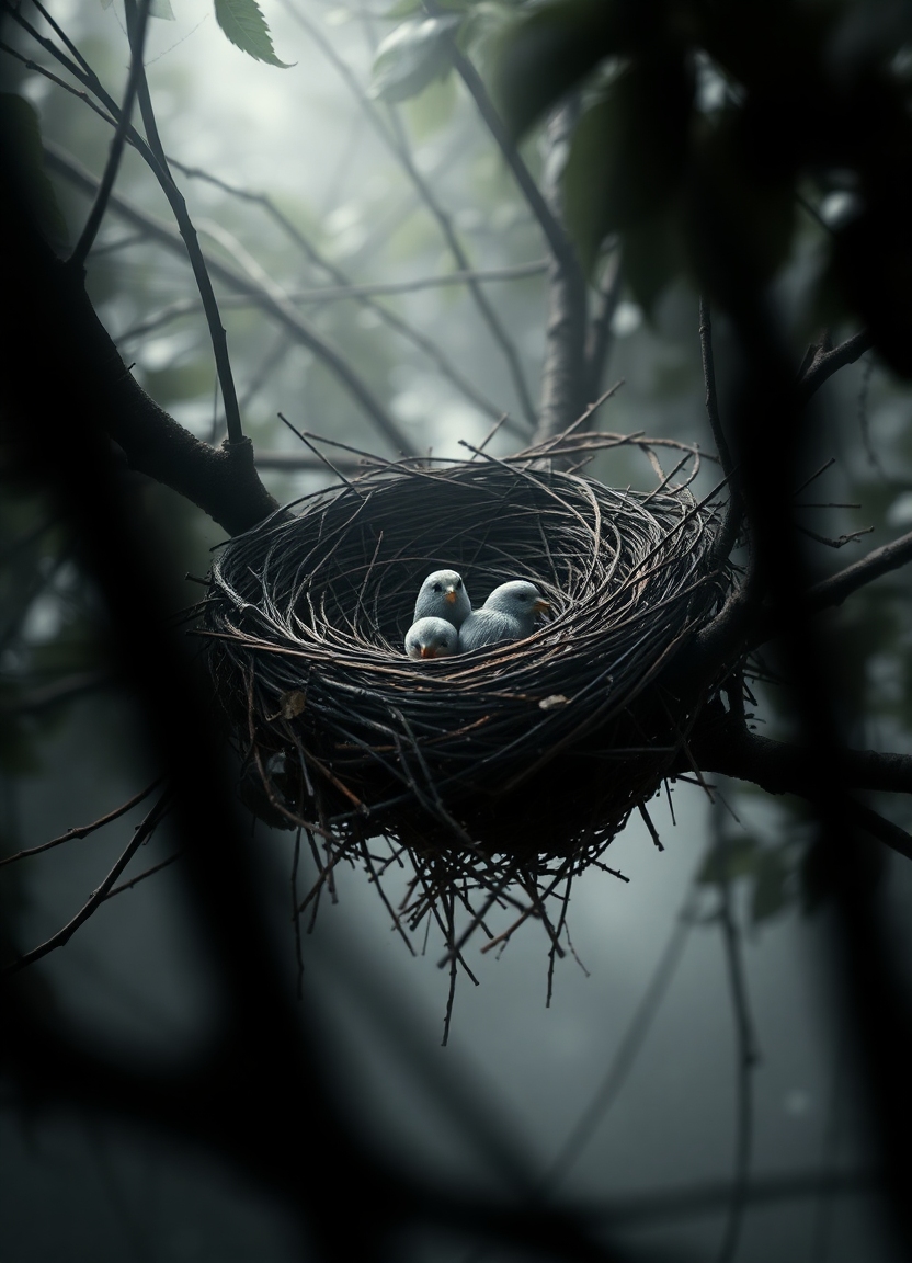 A birds nest, with twigs and leaves, in a tree setting , photorealistic, dramatic shadows, foggy atmosphere, light accents, the shot focuses mainly on the nest, hyperrealistic.