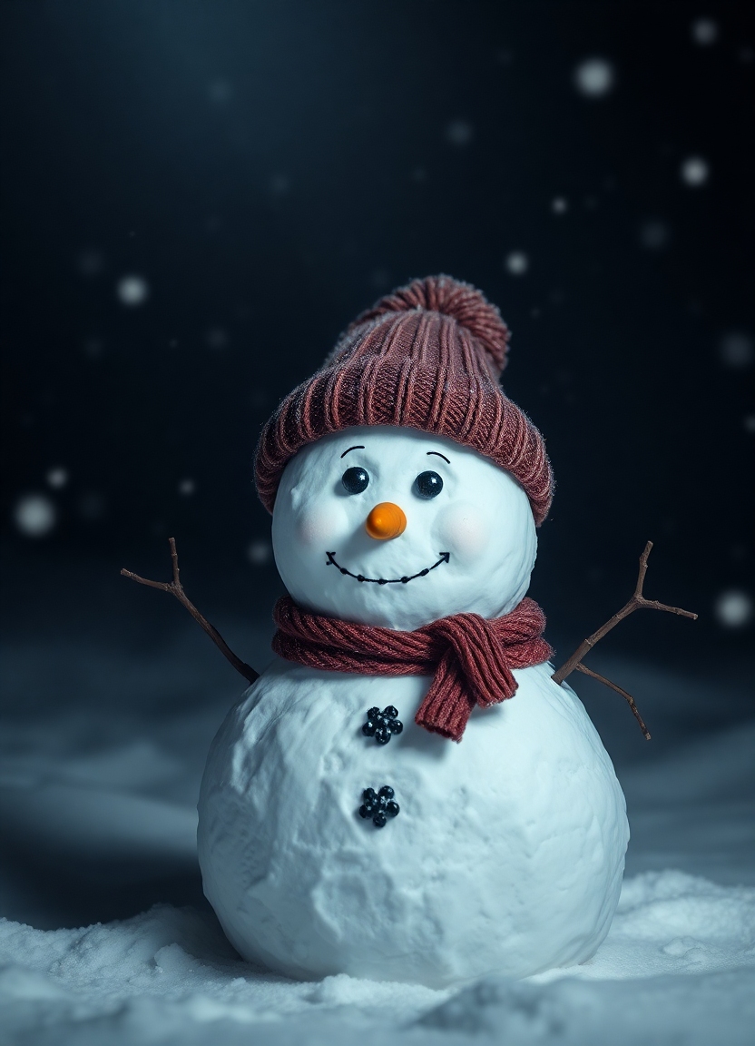 A snowman, with a woolen cap, in a snowy setting , photorealistic, dramatic shadows, foggy atmosphere, light accents, the shot focuses mainly on the snowman, hyperrealistic.also png format