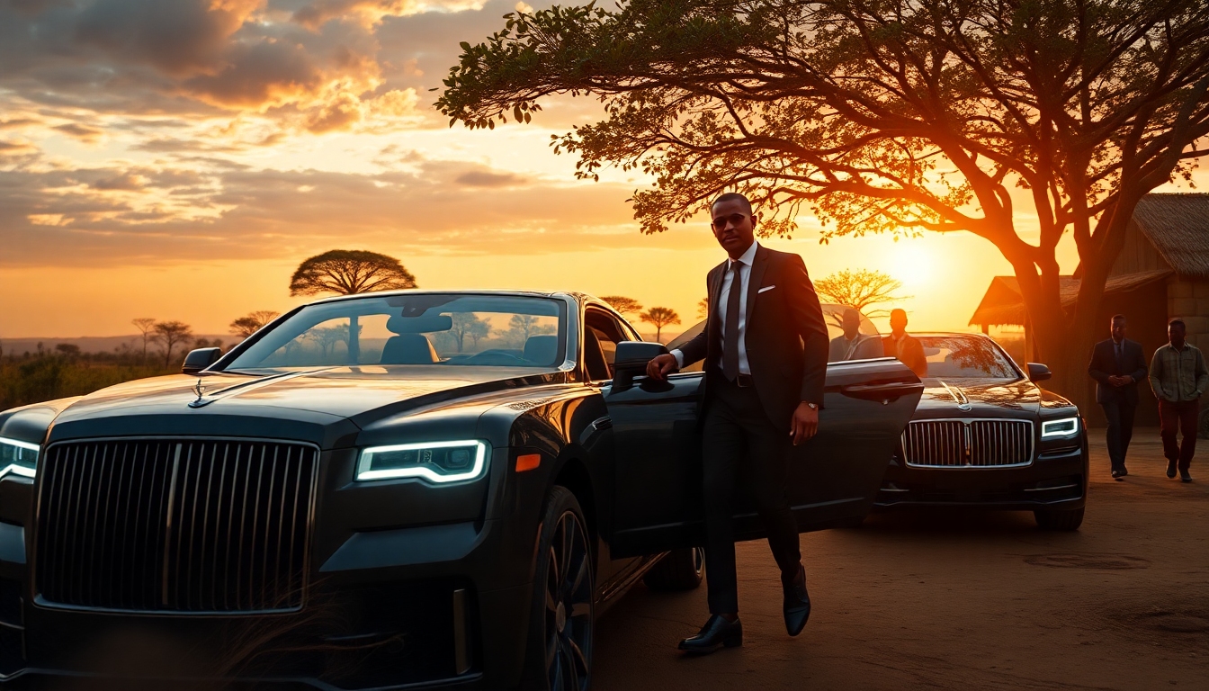 modern luxury cars entering small African village, villagers shocked, rich businessman in black suit stepping out, bodyguards behind him, dramatic sunset lighting, cinematic, ultra realistic, 4k