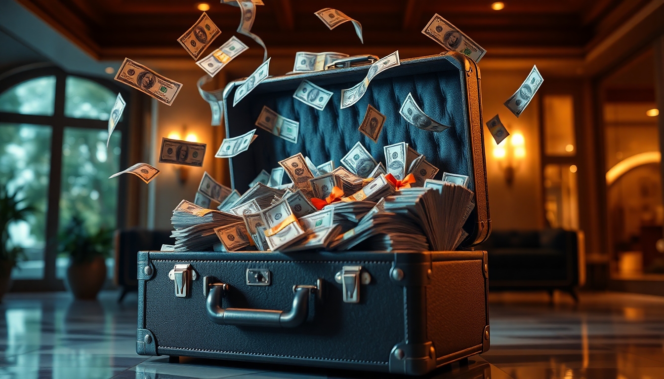open suitcase full of cash bundles, money flying in air, dramatic lighting, luxury house background, cinematic style, ultra realistic, 4k, viral thumbnail style